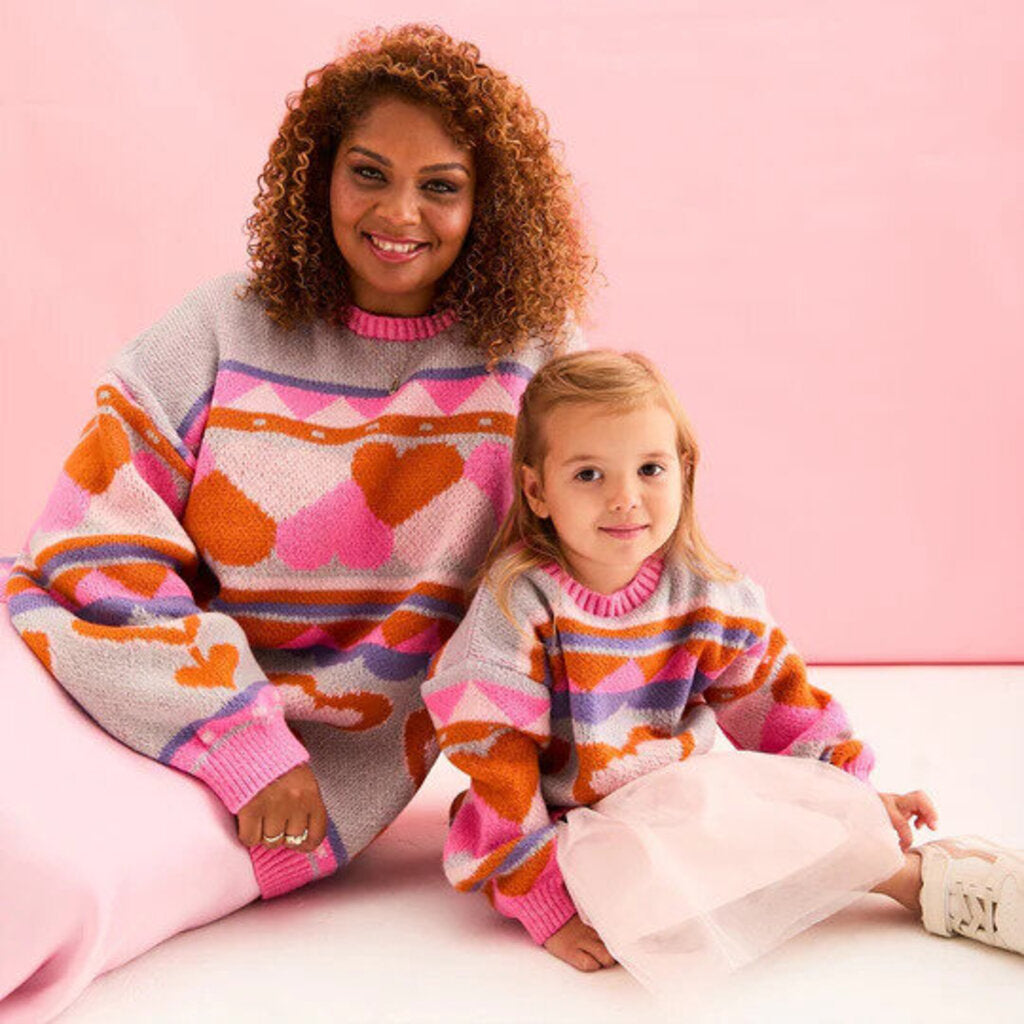 It’s our first Mini Me - and isn’t she adorable! The Poppy Mini Me kid’s knitted jumper is an absolute sweetheart, what with the multicolour heart design in a stunning intarsia knit of orange, blue and pinks. Made to match the coordinating adult intarsia jumper, the Poppy Mini Me is an oversized design with plenty of space for layers and growth spurts.