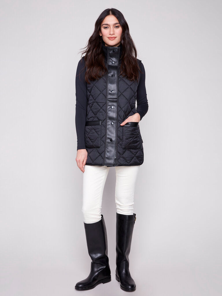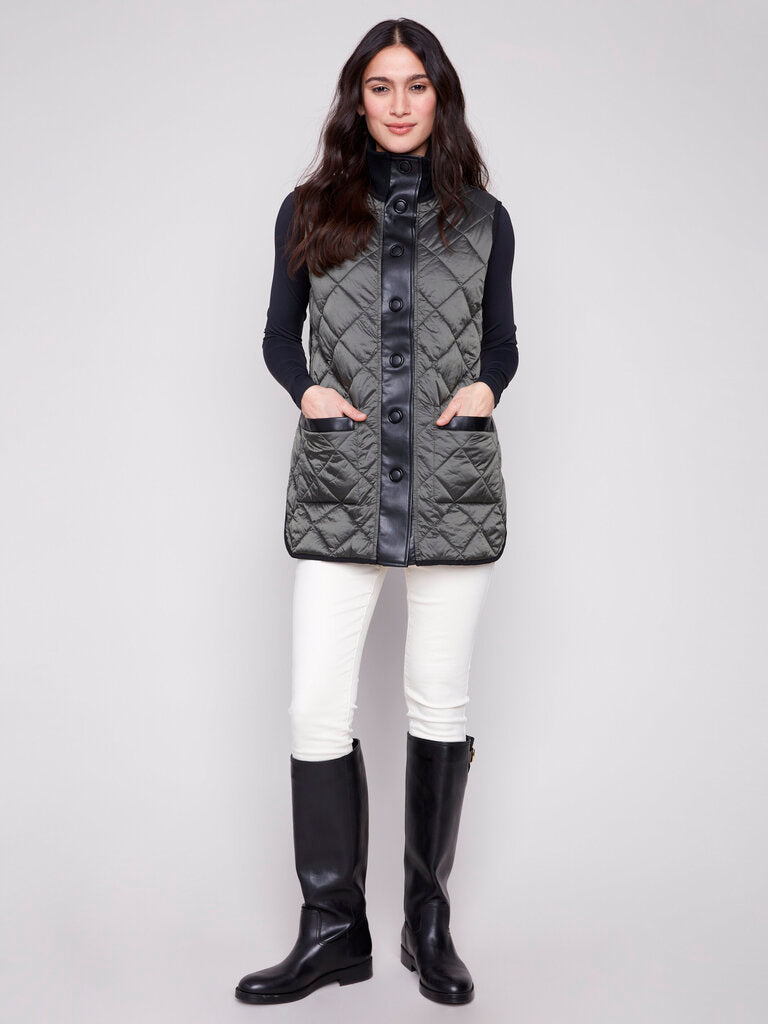 Reversible Button Front Quilted Long Vest. Reverses from spruce to black.