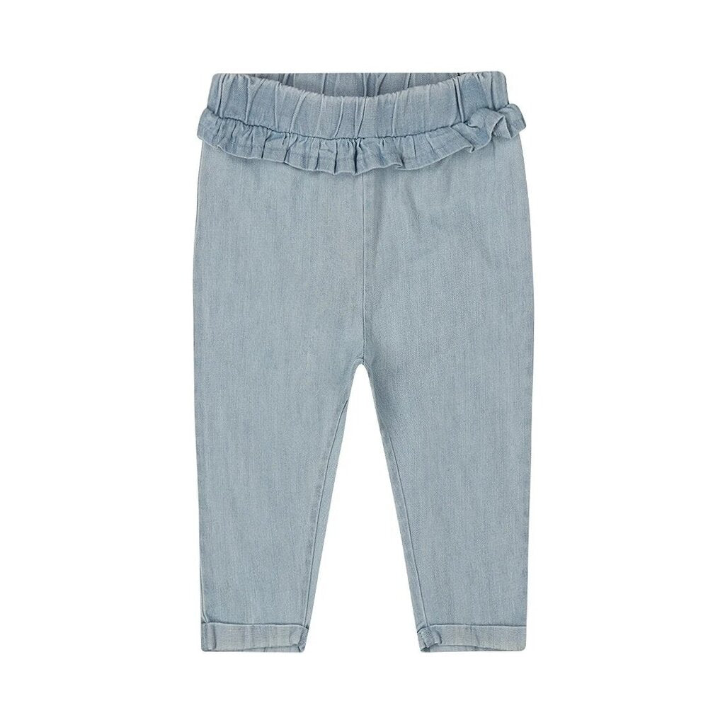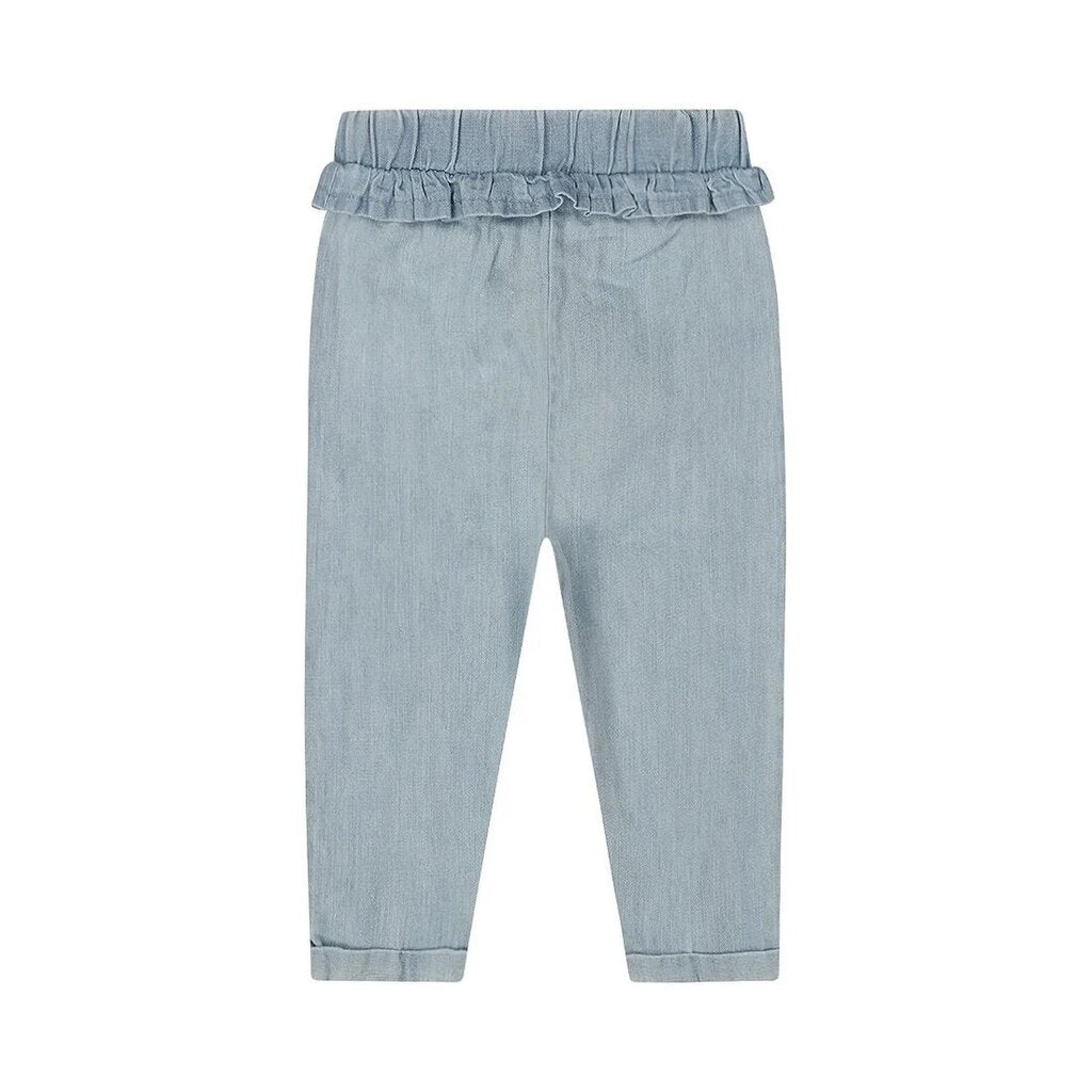 Add a playful and comfortable touch to your little one's wardrobe with these Dirkje trousers. Made from 100% cotton, these trousers offer a lightweight and breathable fabric with a trendy jeans look in blue. The thin, soft material and slightly loose fit ensure a relaxed fit. The girls' trousers have rolled-up legs and cute ruffles around the elasticated hem, providing an extra sweet detail.