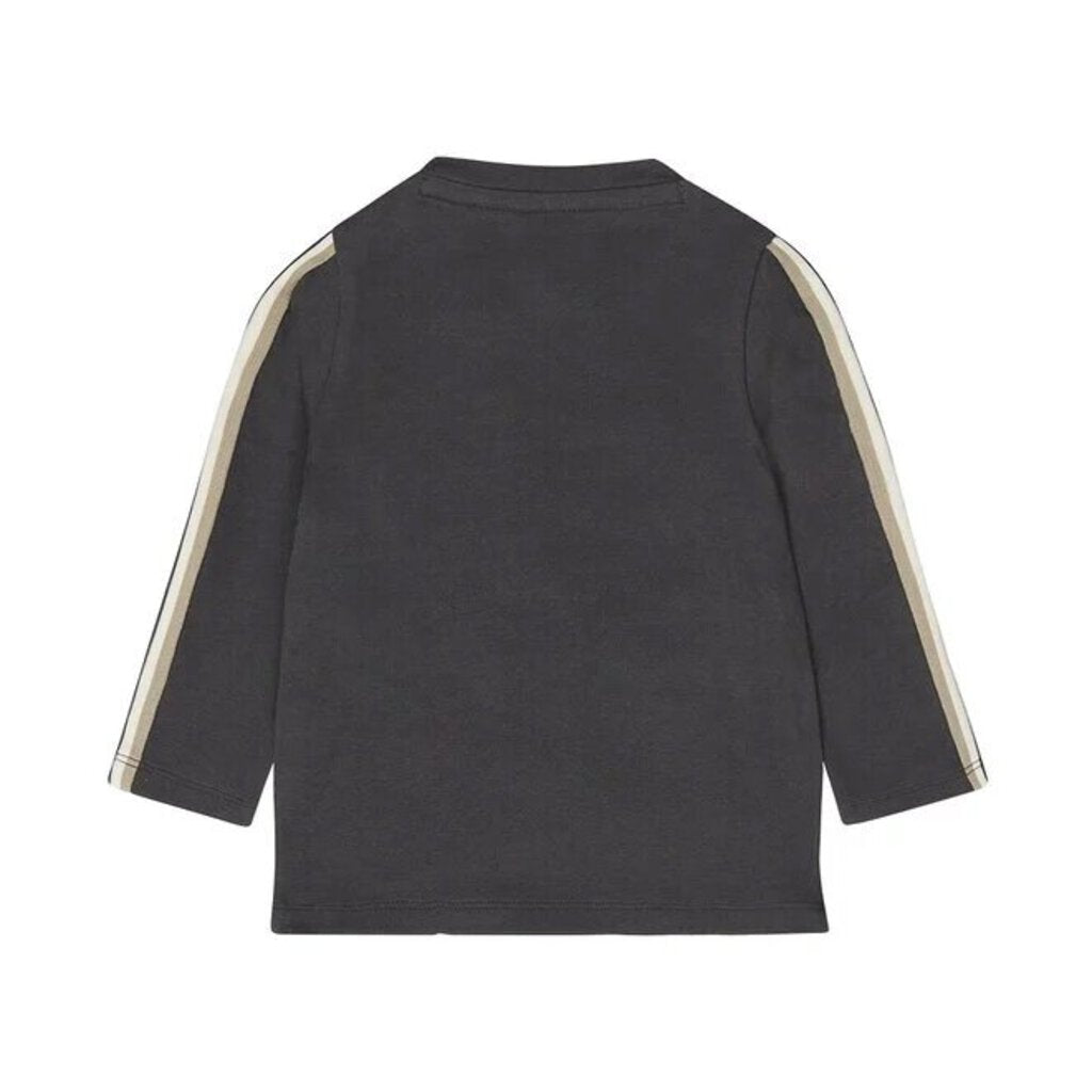 Happy days with this cute longsleeve from Dirkje. The boy's longsleeve shirt is grey with soft green details. The shirt features a funny smiley face with chest pocket and the sleeves have a sporty trim.