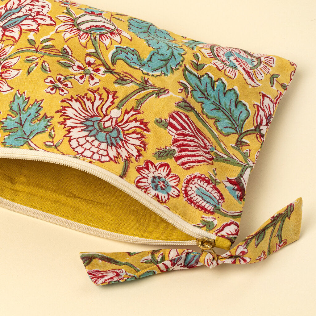 Bright, bold, and beautifully made, the Block Print Pouch in Yellow is your go-to for stylish organization. Hand block printed using traditional crafting methods, this clutch purse features a vibrant floral motif on natural cotton, finished with a matching solid lining and a coordinating fabric zipper pull. Designed with a durable YKK zipper and crafted from sustainable materials, it's perfect for corralling small essentials in your tote, organizing travel makeup, or making a statement on its own as a clutch. Light, versatile, and artisan-made, it’s function wrapped in personality.