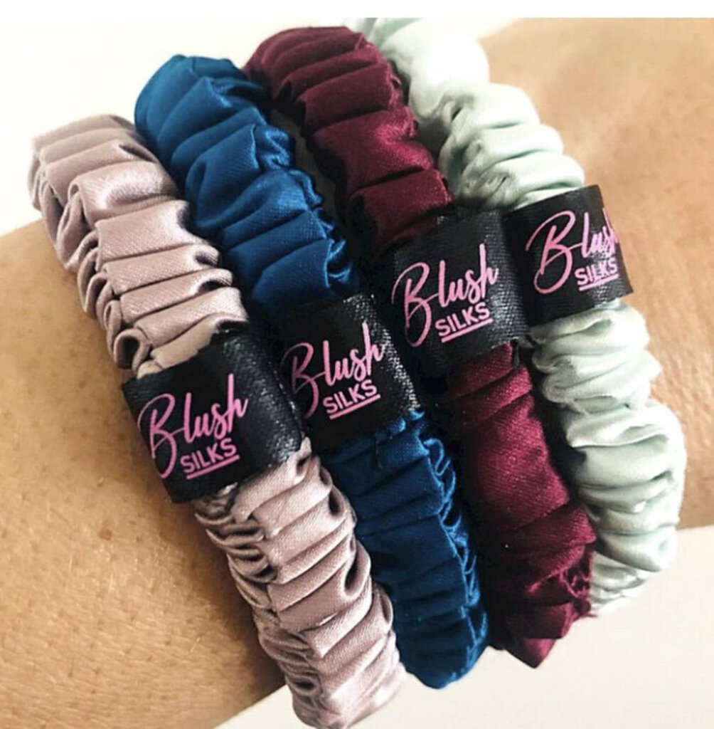 Blush Silks Scrunchie minis are made from the same Highest Grade 6A, 100% Pure Mulberry Silk as our adored pillowcases. Throw away the harsh ties and acquaint your locks with a mini hair tie miracle.