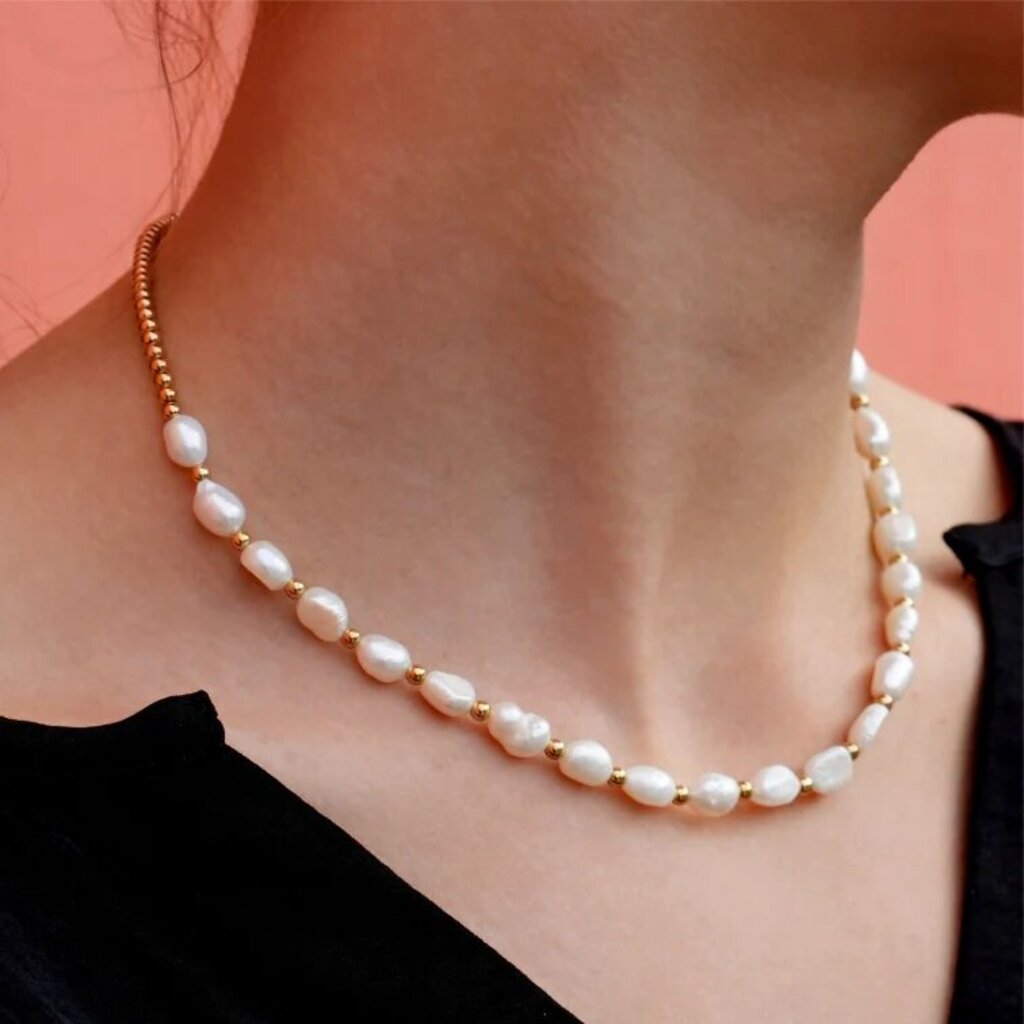 Drape yourself in luxury with this chain necklace featuring captivating freshwater pearls and gleaming gold ball-beads. This accessory encapsulates the essence of opulence and modern allure.
