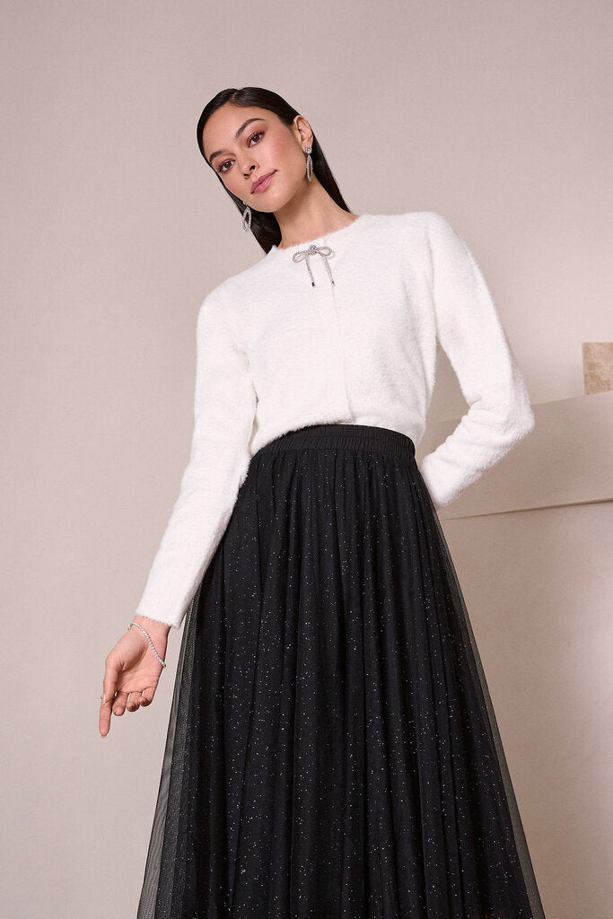 This charming long sleeve cardigan features a delicate rhinestone bow at the neckline, adding a chic touch to any look. Crafted from soft feather yarn with a discreet snap closure, it offers lightweight warmth, making it perfect for any season.
