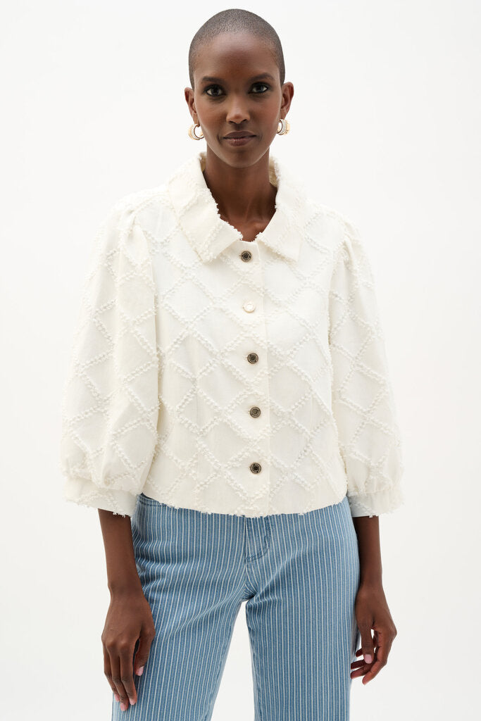 Crafted from cotton twill, this jacket blends structure with feminine detail. Designed with a crew neckline, three-quarter balloon sleeves with cuffs, and hidden side-seam pockets, it’s finished with a diamond pattern for subtle texture.