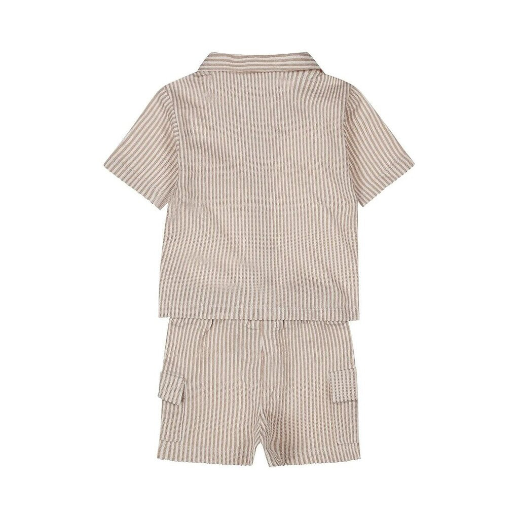 This cute Dirkje set with blouse and shorts combines style with comfort. Made from a soft brown and off white striped fabric with plenty of stretch, this set offers your little one optimal freedom of movement. The boys' blouse has short sleeves, a cute chest pocket, and buttons at the front for a playful look. The matching shorts feature an elasticated waistband and cool side pockets. Perfect for hot summer days!