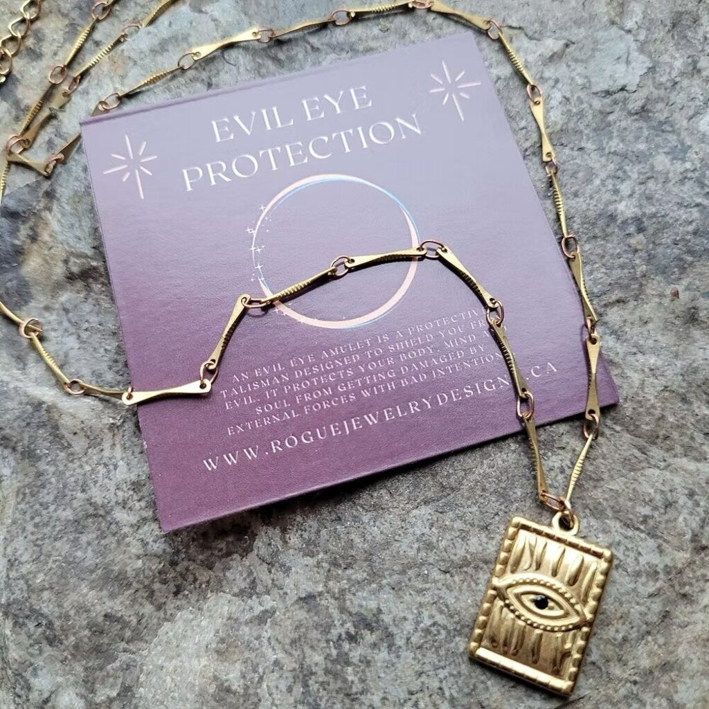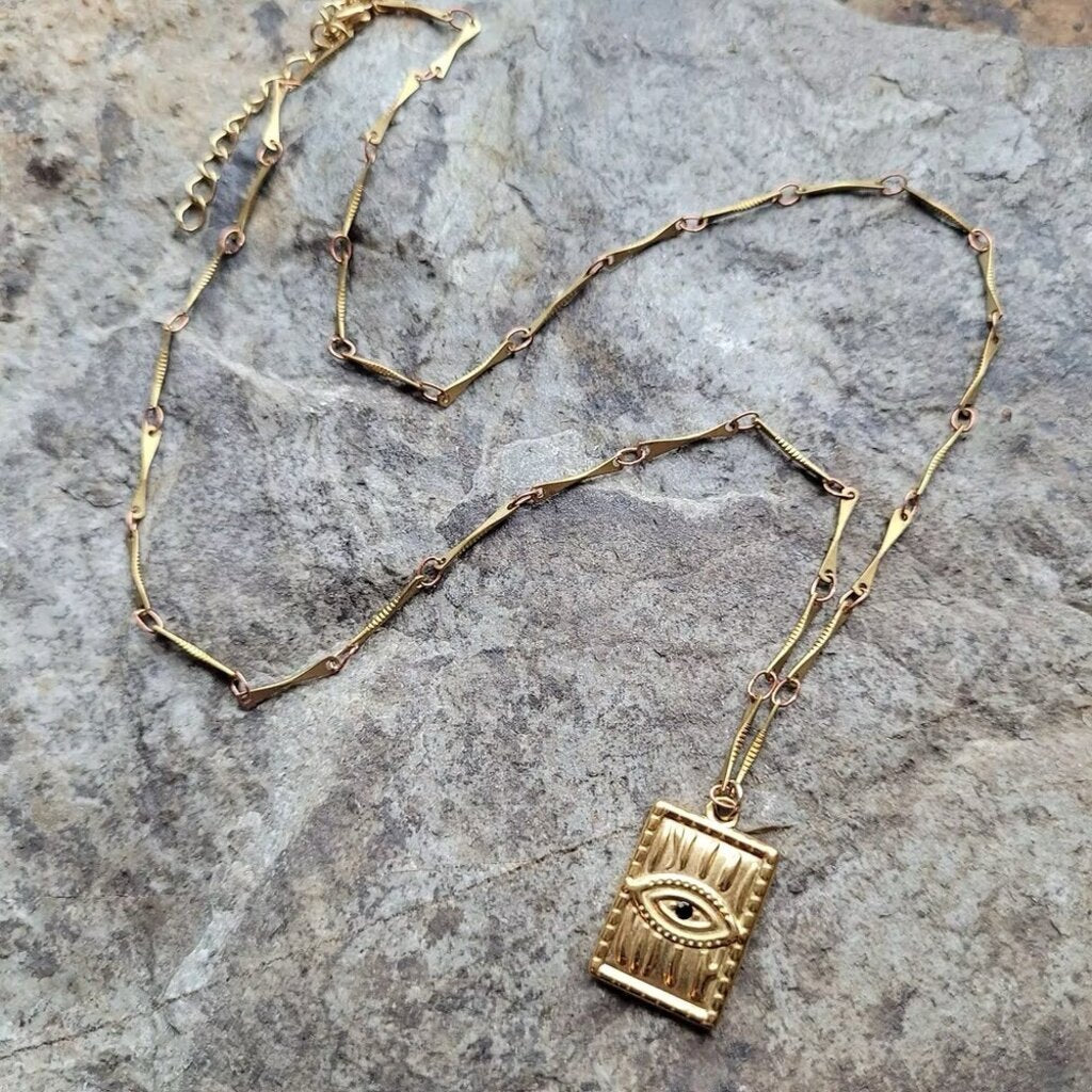 The evil eye necklace is a symbol of protection. 19 inch brass bar chain with a 1.5 inch extender chain. Necklace comes with Evil Eye protection card as pictured.