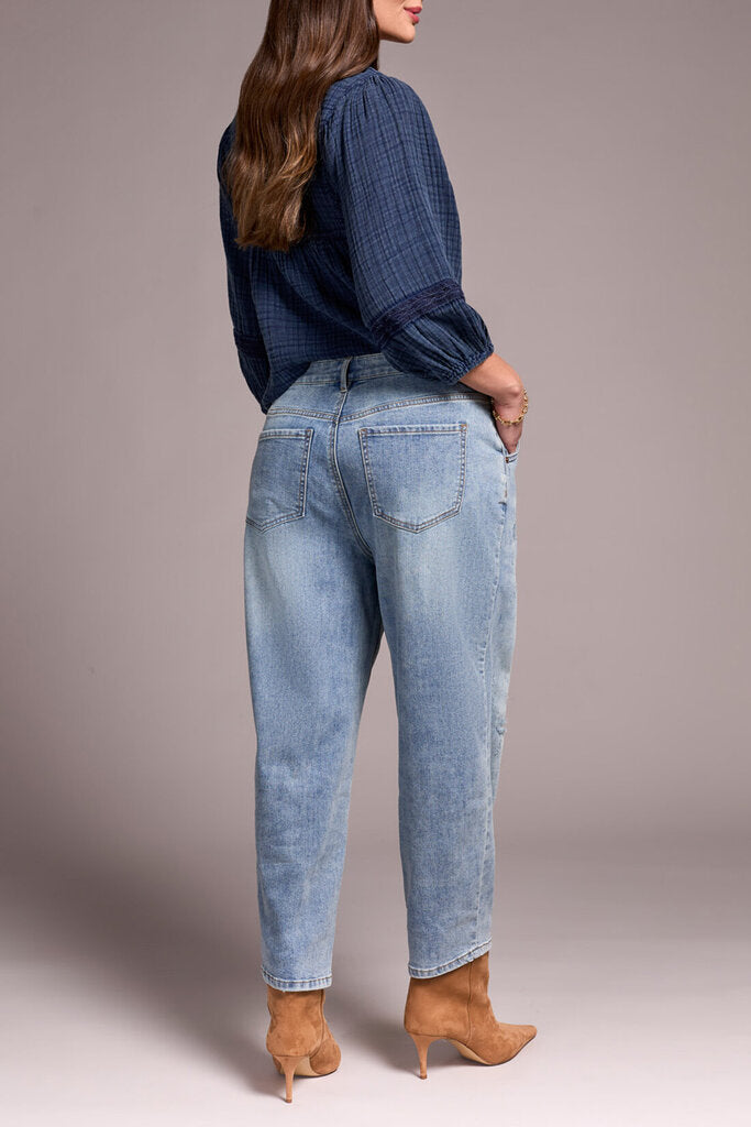 Add effortless flair to your look with these relaxed girlfriend jeans, designed with a mid-rise waist and tapered leg for a flattering fit. Featuring front pleats and hem darts, the design adds a touch of structure to the laid-back style, while the stretch denim offers unbeatable comfort and flexibility. A distressed finish completes the look, adding just the right amount of casual edge to your everyday style.
