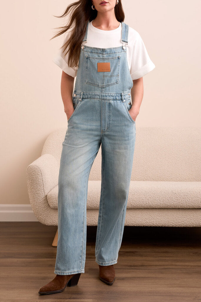 For a retro-inspired look, these relaxed denim overalls deliver effortless style with a flattering square neckline, perfect for layering over a top. Featuring a straight-leg design, they offer a comfortable, flowy fit, while back darting shapes the silhouette for a more flattering look. Front patch details elevate the design, making these overalls a trendy must-have in your wardrobe.