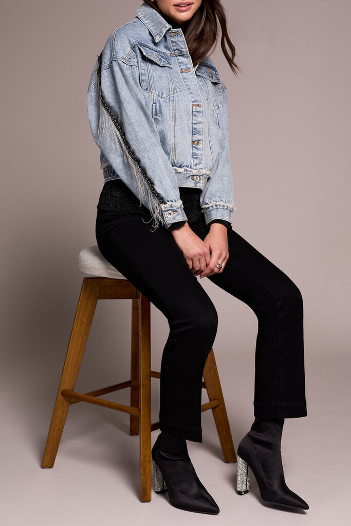 OBSESSED with this denim jacket from Tribal. Featuring a chain fringe with mesh detail on a blue wash relaxed fit denim jacket. Pair this with black jeans and heels for a trendy look.