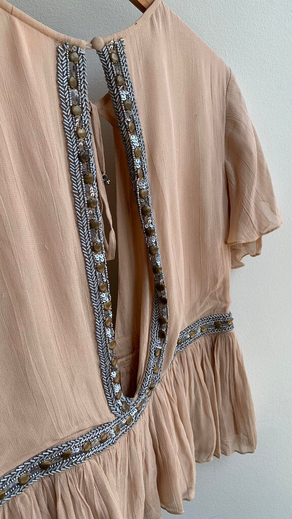Pre-Owned Some Days Lovin Tan Sequin Beaded Open Back Blouse - Size Small