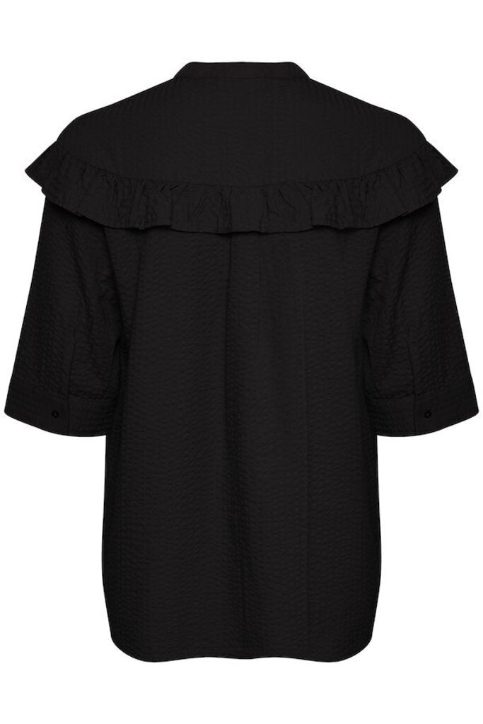 Black shirt with short sleeves and a ruffle detail on the chest and button closure.. The model is 181 cm tall and is wearing a size M.