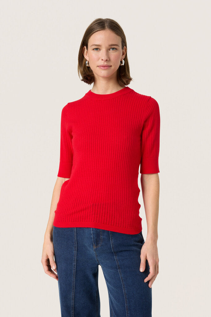 Knitted top with a round neckline and short sleeves in a ribbed design. Made from a soft material for a comfortable fit and an elegant look. Perfect for both casual and more formal styles. The model is 176 cm tall and wears size M.Fit