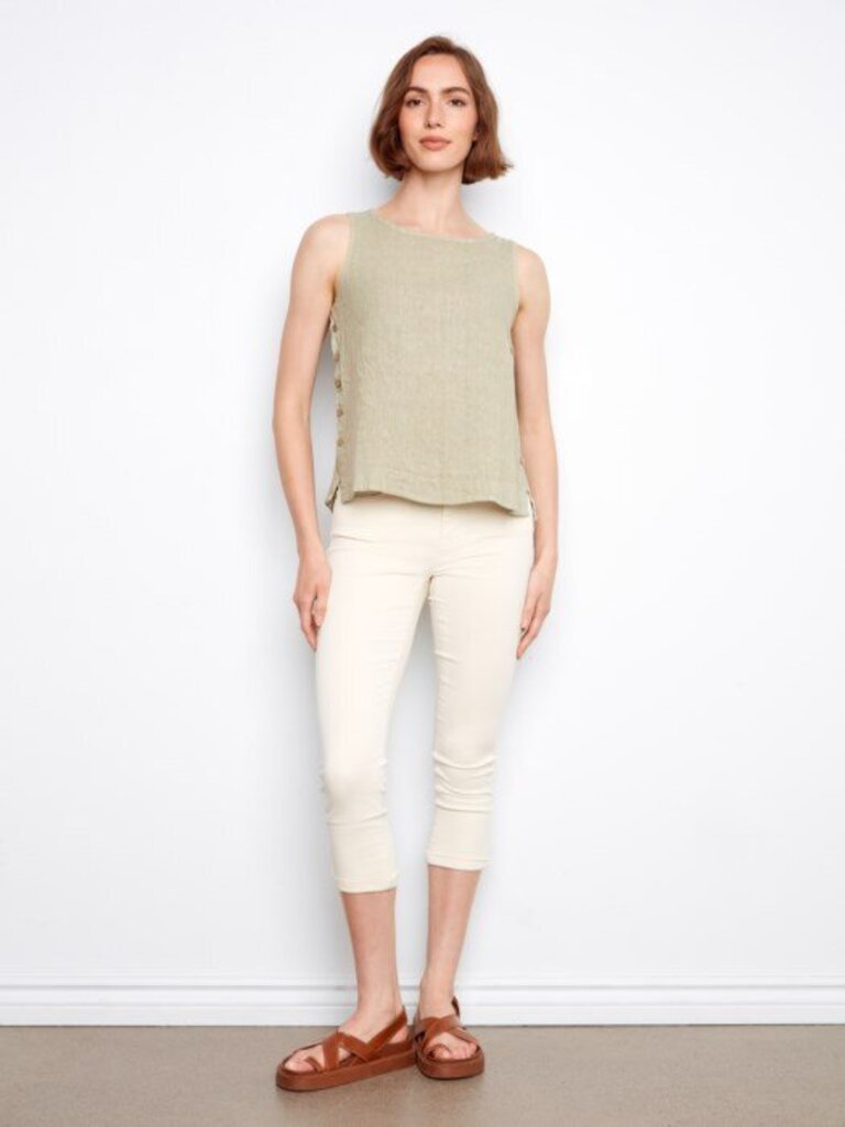 Spring forward to summer fun in this light and breezy sleeveless tank top. The side button detail adds charm and a 100% linen construction keeps you cool and comfortable all day long.