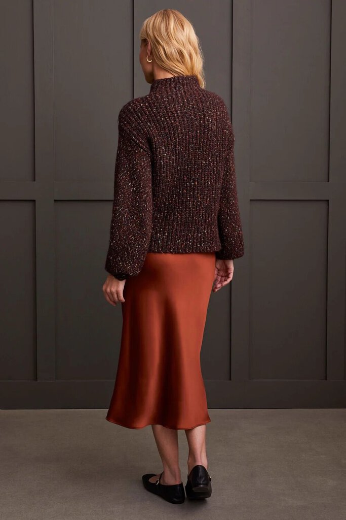 We love the rich hue of this 'coffee bean' coloured sweater from Tribal. Featuring a relaxed fit, funnel neck, and cable knit. Pair with the Tribal satin skit in Marsala for a cute 'fit!