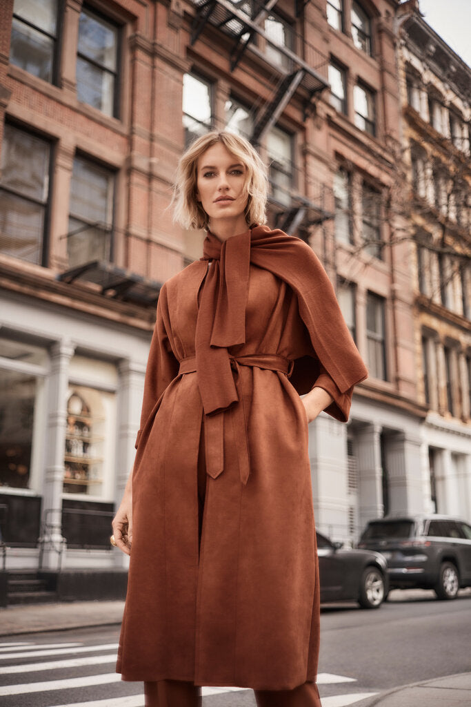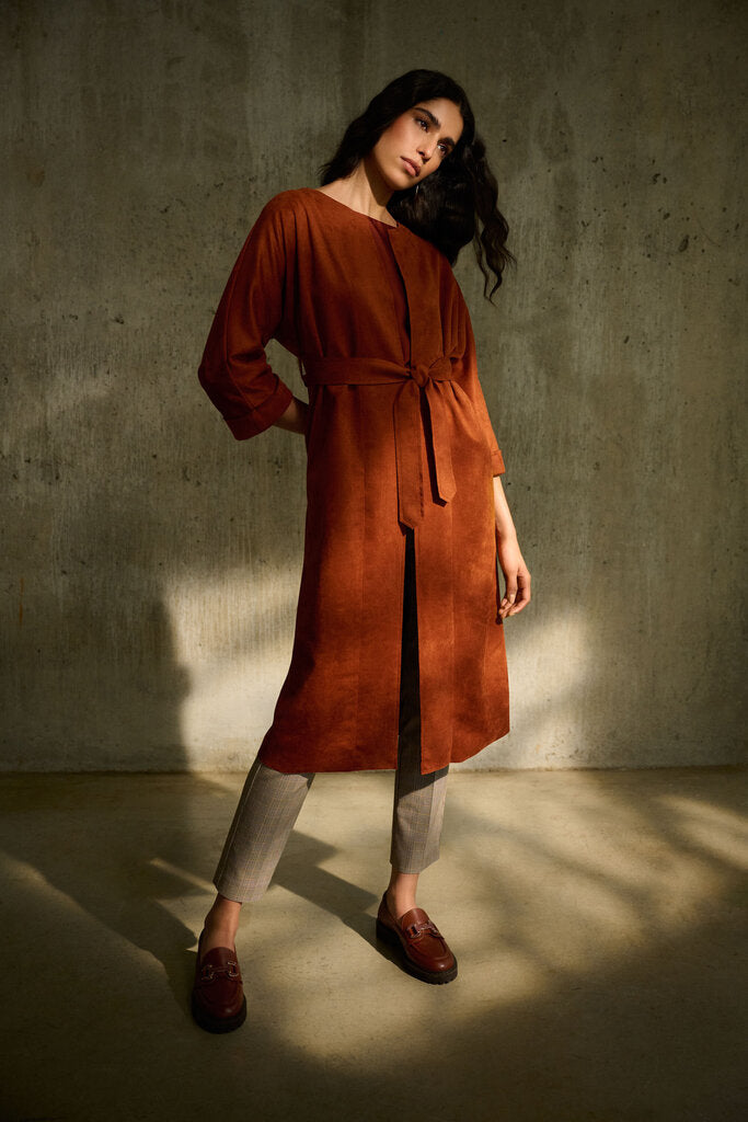 This scuba suede straight fit coat possesses an effortless elegance that can carry you from day to night. This versatile piece features cuffed three-quarter dolman sleeves, a sleek scoop neckline and convenient side pockets to keep your essentials. The stylish front closure with a sash and the center back seam with a vent add a hint more sophistication to this fashion staple.