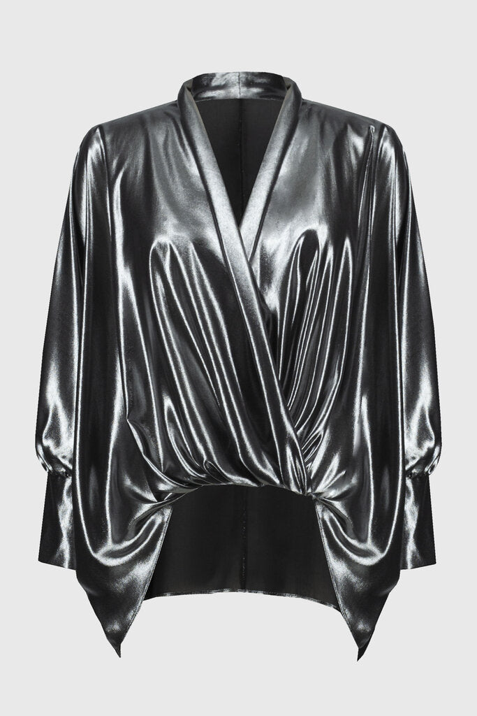 Prepare to shine in this metallic foiled chiffon wrap top, destined for special occasions. The cuffed dolman sleeves and refined wrap silhouette make this piece effortless and timeless.