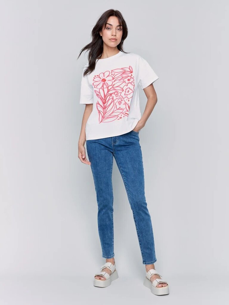 Stand out with this loose-fit graphic t-shirt in a crisp white shade. The graphic floral print adds a fun and bold touch to your look. Made with a blend of soft cotton and a touch of stretch for comfort, it's perfect for casual, laid-back moments this spring and summer.