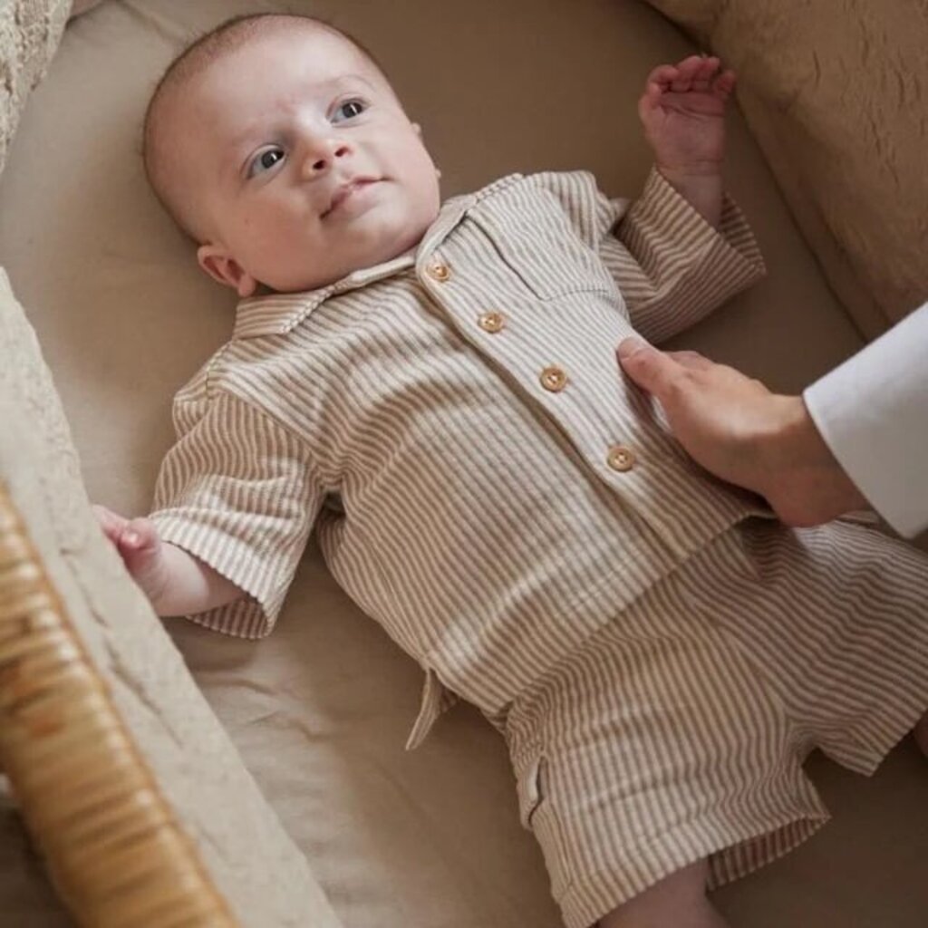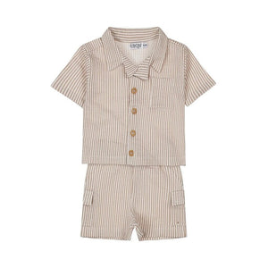 This cute Dirkje set with blouse and shorts combines style with comfort. Made from a soft brown and off white striped fabric with plenty of stretch, this set offers your little one optimal freedom of movement. The boys' blouse has short sleeves, a cute chest pocket, and buttons at the front for a playful look. The matching shorts feature an elasticated waistband and cool side pockets. Perfect for hot summer days!