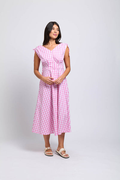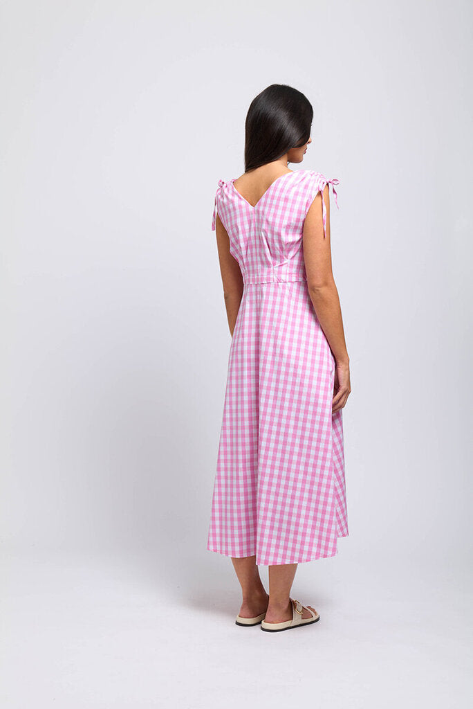 We're picturing a 50's backyard barbeque in this stunning little number from New Zealand based FOIL. Wear it two ways! This dress is designed to be worn with the buttons either in the front or the back. Featuring a beautiful pink/white gingham print, full skirt and rouched shoulder.