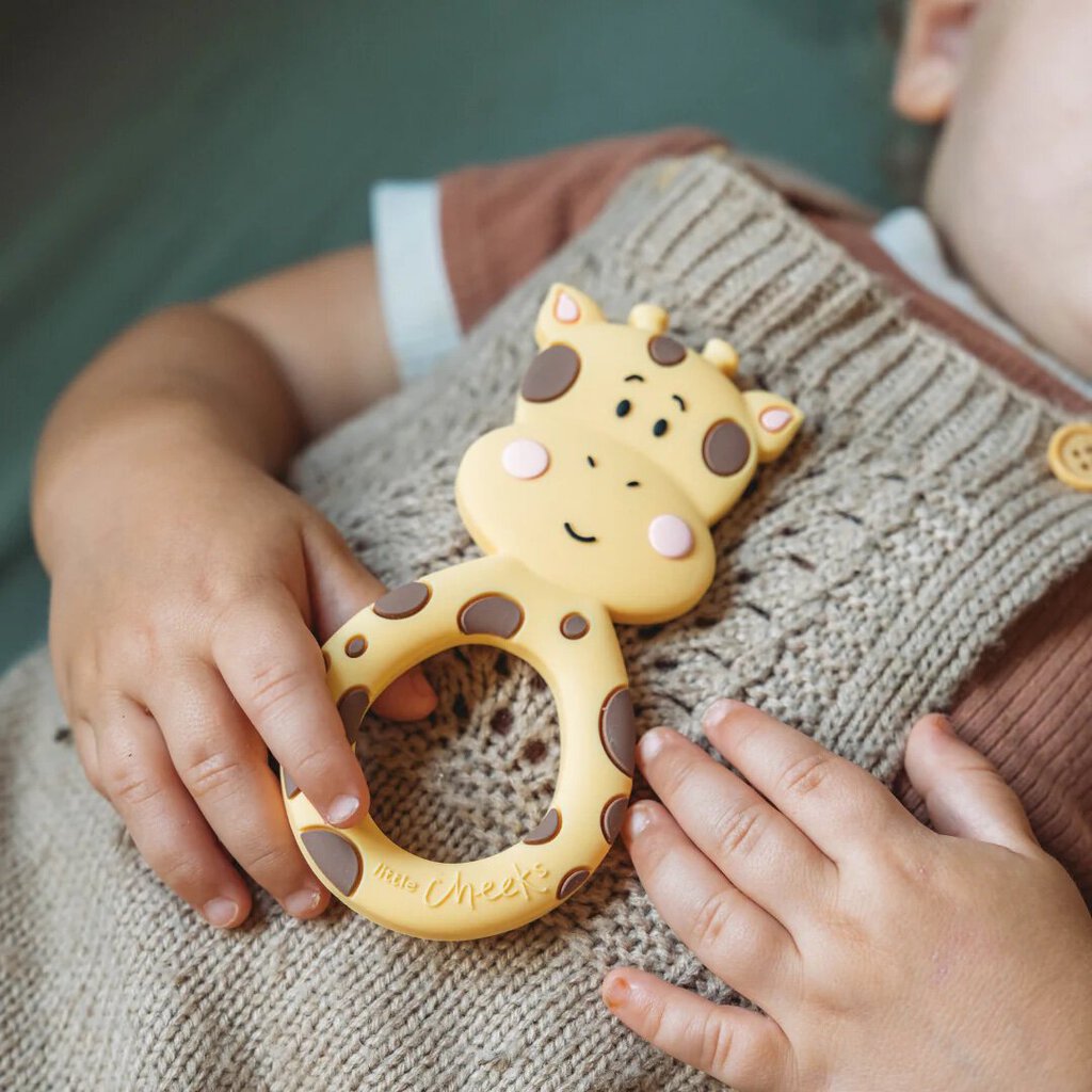 These adorable giraffes were drawn and designed exclusively by Little Cheeks. Their hollow design makes them easy for little hands to grab, and their smooth and textured surfaces provide added relief for your baby's gums. Seeing as they are pure silicone, they are also very easy to clean. Simply wash with mild soap and water, or throw them on the top shelf of the dishwasher. You can also put them in the freezer for extra relief when those painful teeth start poking through.