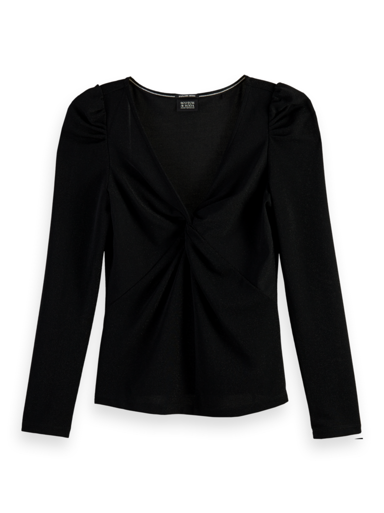 This long-sleeved top has a V-neck opening with twist detail at the centre bust. Complemented with gathering at the shoulders with mid and side seam detailing on the front for a clean, streamlined look.