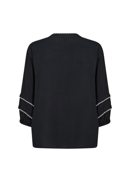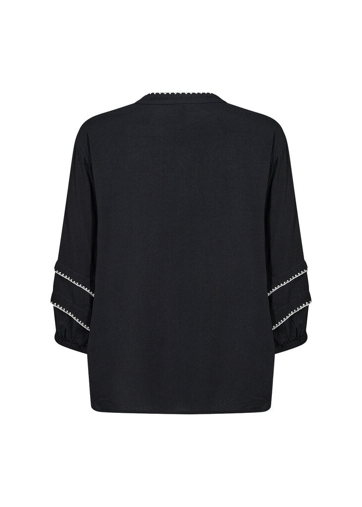 SC-RADIA 216 is a Shirt, crafted from 100% LENZING™ ECOVERO™ Viscose. This design includes a V-neck with detailed stitching along the edges, button closures, and three-quarter sleeves with embroidered accents. Pair it with jeans for a relaxed look or dress it up with tailored trousers for a more refined style.