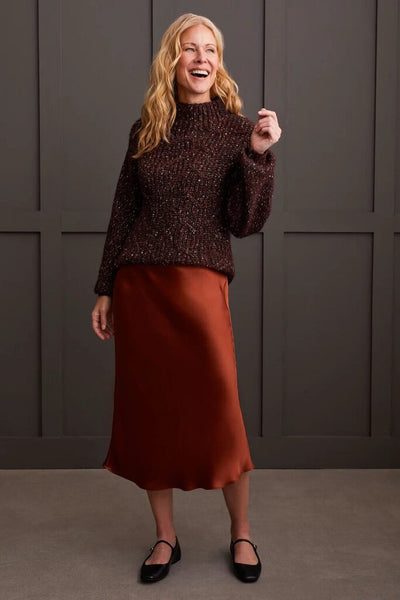 We love the rich hue of this 'coffee bean' coloured sweater from Tribal. Featuring a relaxed fit, funnel neck, and cable knit. Pair with the Tribal satin skit in Marsala for a cute 'fit!